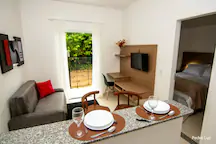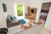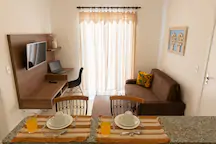 Flats que unem o acolhimento de uma casa confortável à praticidade da hospedagem, com cozinha gourmet equipada para preparar suas próprias refeições, ambiente dedicado para Home Office e toda a tranquilidade do Condomínio Apart Sol Nascente — um espaço seguro, com piscina e um bosque particular exclusivo.