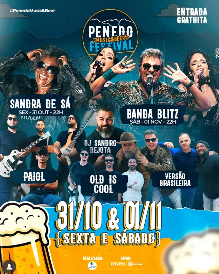O evento contará com grandes apresentações de Sandra de Sá, Banda Blitz, Versão Brasileira, Paiol, Old is Cool e DJ Sandro Dejota, prometendo agitar o público com shows cheios de sucesso e boas vibrações! 🎤🎸